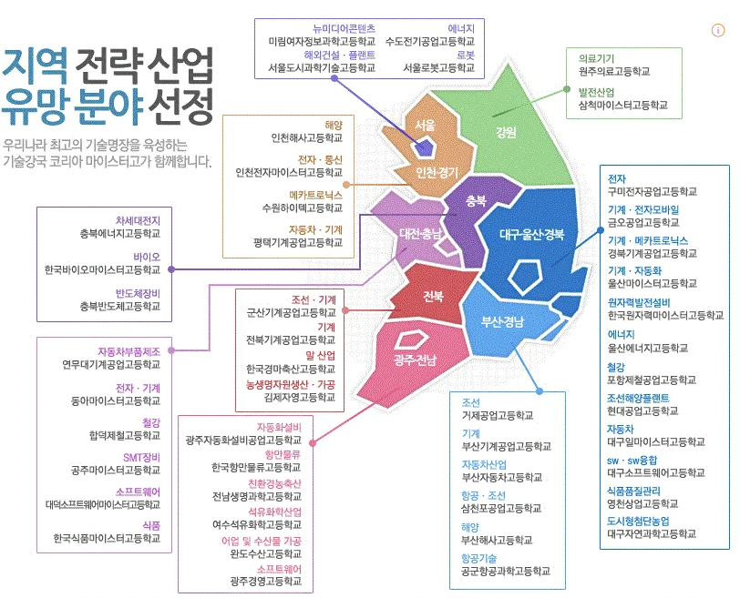 - 종류: 산업계 수요가 많은 기계, 전자, 화학, 항공, 바이오, 자동차, 로봇, 반도체, 조선, 에너지, 철강, 해양 등의 고등학교